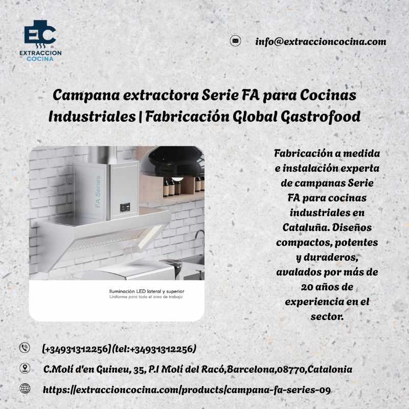 Fabricación a medida e instalación experta de campanas Serie FA para cocinas industriales en Cataluña. Diseños compactos, potentes y duraderos, avalados por más de 20 años de experiencia en el sector.